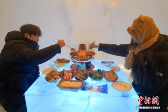 冰堡體驗(yàn)休息室布置了冰床、冰沙發(fā)等冰制陳設(shè),讓游客沉浸式體驗(yàn)冰雪住宿的新奇樂趣。 趙宇航 攝 在用雪打造的屋子里,羊肉片、凍豆腐、青菜拼盤等食材已經(jīng)擺好,陸續(xù)有游客前來體驗(yàn)雪屋火鍋的“冷熱交替”?!巴饷媪阆露?,吃著沸騰的火鍋很刺激?!北本┯慰蛣⒉┛≌f。