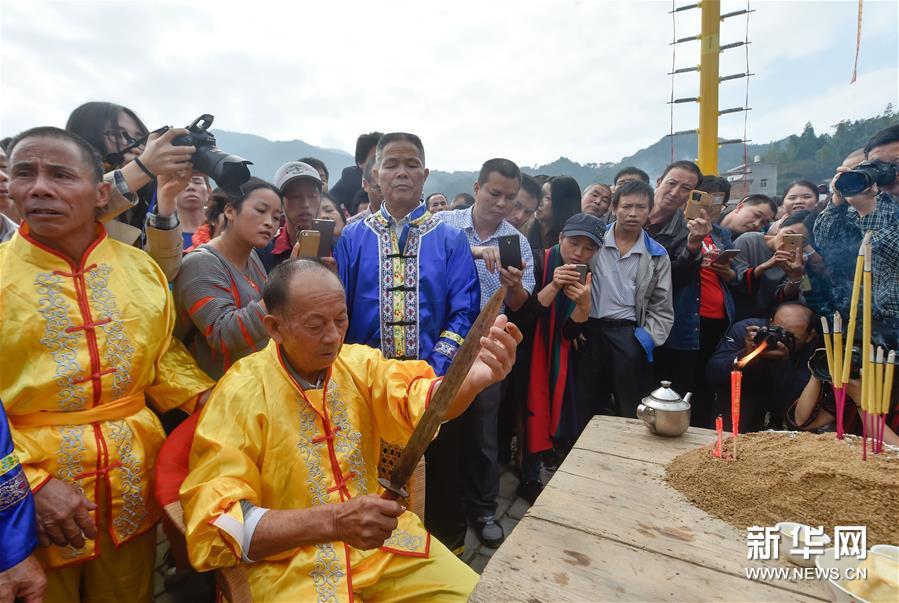 農(nóng)歷十月十五前后,福建西部武平縣各山村陸續(xù)進入農(nóng)閑時節(jié)。按照當?shù)仫L(fēng)俗,不同村子各自擇日舉辦民間活動,其中較有代表性的就是“上刀山”絕技?!吧系渡健苯^技在閩西山村流傳已有數(shù)百年歷史,表演者需光腳順著磨得鋒利閃亮的36把鋼刀,攀登至8米高的杉木柱子頂部,接受長者祝福,祈求風(fēng)調(diào)雨順、五谷豐登。新華社記者 宋為偉 攝