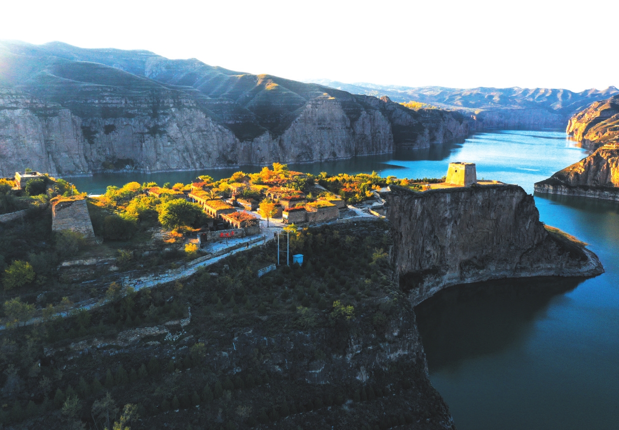 2015年的夏天,我又一次來到老牛灣,105米高的萬家寨水電大壩飛跨晉蒙,黃河水在絕壁中安靜了、變綠了。老牛灣村前的小河倒灌進了黃河水,一個灣成了兩個灣,團團地圍住了山村,又好似老牛彎出了兩個碧綠的牛角,太漂亮了。老鄉(xiāng)們說:“有企業(yè)來開發(fā)道路、景區(qū)了,也有北京游客開車來游玩了,拍照的多,照幾張相就走了?!蓖侨匀粴埰频拈T樓和石板院房,我不知該說什么、能說什么。