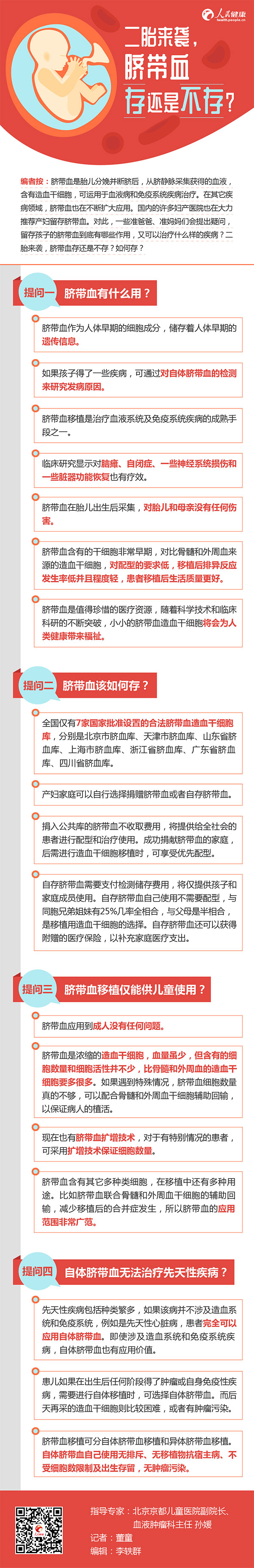 編者按:臍帶血是胎兒分娩并斷臍后,從臍靜脈采集獲得的血液,含有造血干細胞,可運用于血液病和免疫系統(tǒng)疾病治療。在其它疾病領域,臍帶血也在不斷擴大應用。國內的許多婦產醫(yī)院也在大力推薦產婦留存臍帶血。對此,一些準爸爸、準媽媽們會提出疑問,留存孩子的臍帶血到底有哪些作用,又可以治療什么樣的疾???二胎來襲,臍帶血存還是不存?如何存?