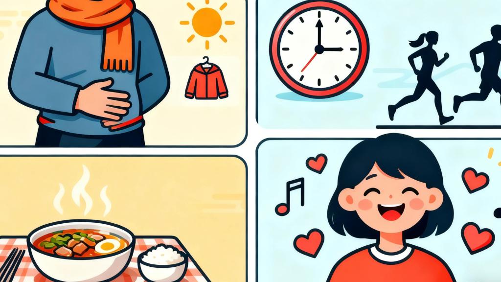 腹部保暖、三餐定時(shí)、規(guī)律作息、情緒管理是護(hù)胃“四大法寶”。AI繪圖??秋冬季如何打好“胃腸保護(hù)戰(zhàn)”?專家認(rèn)為,首先是做好腹部保暖,及時(shí)增添衣物,尤其要避免腹部暴露在冷空氣中,不要長時(shí)間處于寒冷環(huán)境。其次,飲食要以溫?zé)嵋紫癁橹?,盡量不吃生冷食物,三餐定時(shí)定量,減少腸道負(fù)擔(dān)。第三,規(guī)律作息,避免熬夜,結(jié)合適當(dāng)體育鍛煉促進(jìn)血液循環(huán),增強(qiáng)胃腸蠕動(dòng),提高身體的耐寒能力和免疫力,以此增強(qiáng)胃腸抵抗力。最后,焦慮和抑郁是胃腸疾病的“催化劑”,要學(xué)會(huì)釋放壓力,保持心情愉悅,不讓壞情緒“傷”胃。
