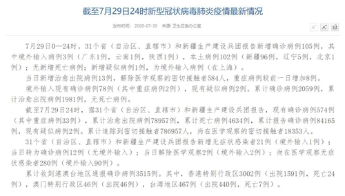 情況顯示,截至7月29日24時,據(jù)31個省(自治區(qū)、直轄市)和新疆生產(chǎn)建設(shè)兵團報告,現(xiàn)有確診病例574例(其中重癥病例33例),累計治愈出院病例78957例,累計死亡病例4634例,累計報告確診病例84165例,現(xiàn)有疑似病例2例。累計追蹤到密切接觸者786957人,尚在醫(yī)學(xué)觀察的密切接觸者18353人。