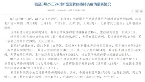 人民網(wǎng)北京8月26日電(董童)國家衛(wèi)生健康委于今日在官網(wǎng)發(fā)布的《截至8月25日24時新型冠狀病毒肺炎疫情最新情況》(以下簡稱“情況”)提出,8月25日0—24時,31個?。ㄗ灾螀^(qū)、直轄市)和新疆生產(chǎn)建設(shè)兵團(tuán)報告新增確診病例15例,均為境外輸入病例(四川5例,上海4例,廣東4例,天津1例,云南1例);無新增死亡病例;無新增疑似病例。當(dāng)日新增治愈出院病例54例,解除醫(yī)學(xué)觀察的密切接觸者1249人,重癥病例較前一日減少3例。