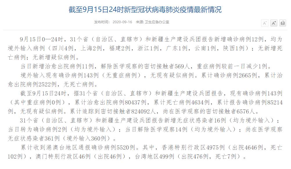 人民網(wǎng)北京9月16日電(董童)國家衛(wèi)生健康委于今日在官網(wǎng)發(fā)布的《截至9月15日24時新型冠狀病毒肺炎疫情最新情況》(以下簡稱“情況”)提出,9月15日0—24時,31個?。ㄗ灾螀^(qū)、直轄市)和新疆生產(chǎn)建設兵團報告新增確診病例12例,均為境外輸入病例(四川4例,上海2例,福建2例,浙江1例,廣東1例,云南1例,陜西1例);無新增死亡病例;無新增疑似病例。當日新增治愈出院病例11例,解除醫(yī)學觀察的密切接觸者569人,重癥病例較前一日減少1例。