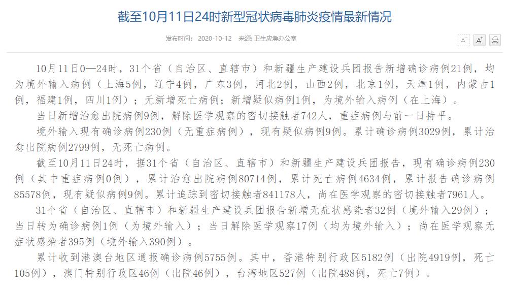 人民網北京10月12日電(董童)國家衛(wèi)生健康委于今日在官網發(fā)布的《截至10月11日24時新型冠狀病毒肺炎疫情最新情況》(以下簡稱“情況”)提出,10月11日0—24時,31個?。ㄗ灾螀^(qū)、直轄市)和新疆生產建設兵團報告新增確診病例21例,均為境外輸入病例(上海5例,遼寧4例,廣東3例,河北2例,山西2例,北京1例,天津1例,內蒙古1例,福建1例,四川1例);無新增死亡病例;新增疑似病例1例,為境外輸入病例(在上海)。當日新增治愈出院病例9例,解除醫(yī)學觀察的密切接觸者742人,重癥病例與前一日持平。