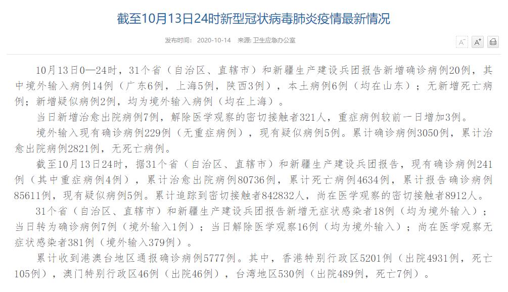 人民網(wǎng)北京10月14日電(董童)國(guó)家衛(wèi)生健康委于今日在官網(wǎng)發(fā)布的《截至10月13日24時(shí)新型冠狀病毒肺炎疫情最新情況》(以下簡(jiǎn)稱“情況”)稱,10月13日0—24時(shí),31個(gè)?。ㄗ灾螀^(qū)、直轄市)和新疆生產(chǎn)建設(shè)兵團(tuán)報(bào)告新增確診病例20例,其中境外輸入病例14例(廣東6例,上海5例,陜西3例),本土病例6例(均在山東);無新增死亡病例;新增疑似病例2例,均為境外輸入病例(均在上海)。當(dāng)日新增治愈出院病例7例,解除醫(yī)學(xué)觀察的密切接觸者321人,重癥病例較前一日增加3例。