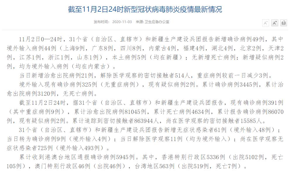 人民網(wǎng)北京11月3日電(董童)國家衛(wèi)生健康委于今日在官網(wǎng)發(fā)布的《截至11月2日24時新型冠狀病毒肺炎疫情最新情況》(以下簡稱“情況”)指出,11月2日0—24時,31個?。ㄗ灾螀^(qū)、直轄市)和新疆生產(chǎn)建設(shè)兵團報告新增確診病例49例,其中境外輸入病例44例(上海9例,廣東8例,四川8例,內(nèi)蒙古4例,福建4例,湖北4例,北京2例,天津2例,江蘇1例,浙江1例,山東1例),本土病例5例(均在新疆);無新增死亡病例;新增疑似病例2例,均為境外輸入病例(均在內(nèi)蒙古)。當日新增治愈出院病例21例,解除醫(yī)學(xué)觀察的密切接觸者514人,重癥病例較前一日減少3例。