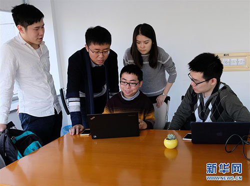 矣曉沅(左三)與同學(xué)們?cè)趯?shí)驗(yàn)室討論會(huì)上(資料照片)。 新華社發(fā)