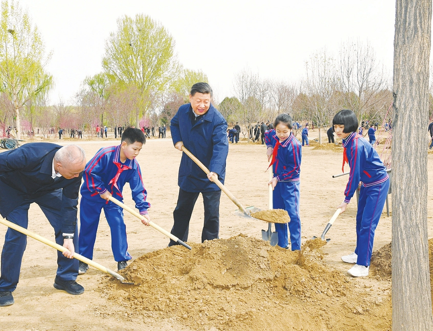 4月8日,黨和國(guó)家領(lǐng)導(dǎo)人習(xí)近平、栗戰(zhàn)書、汪洋、王滬寧、趙樂(lè)際、韓正、王岐山等來(lái)到北京市通州區(qū)永順鎮(zhèn)參加首都義務(wù)植樹活動(dòng)。這是習(xí)近平同大家一起植樹。 新華社記者謝環(huán)馳攝