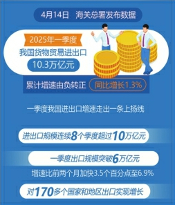 進(jìn)出口規(guī)模連續(xù)8個(gè)季度超過10萬億元;一季度出口規(guī)模突破6萬億元,增速比前兩個(gè)月加快3.5個(gè)百分點(diǎn)至6.9%,對(duì)170多個(gè)國家和地區(qū)出口實(shí)現(xiàn)增長……多項(xiàng)數(shù)據(jù)呈現(xiàn)的積極變化,成為我國外貿(mào)規(guī)模增長、質(zhì)量提升的有力見證。