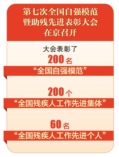 第七次全國自強(qiáng)模范暨助殘先進(jìn)表彰大會16日在北京人民大會堂召開。200名全國自強(qiáng)模范、200個(gè)全國殘疾人工作先進(jìn)集體和60名全國殘疾人工作先進(jìn)個(gè)人受到表彰。