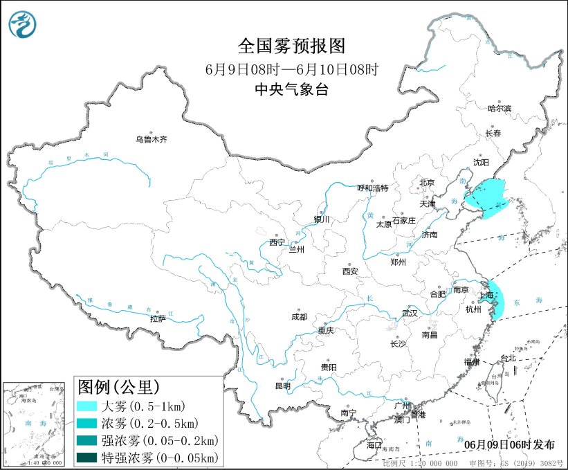 預(yù)計(jì)6月9日白天至夜間,渤海海峽、黃海北部海域、遼東半島東部沿岸海域、成山頭附近海域、長(zhǎng)江口及杭州灣附近海域、舟山群島附近海域、大連港、上海港、寧波港將有能見(jiàn)度不足1公里的大霧。