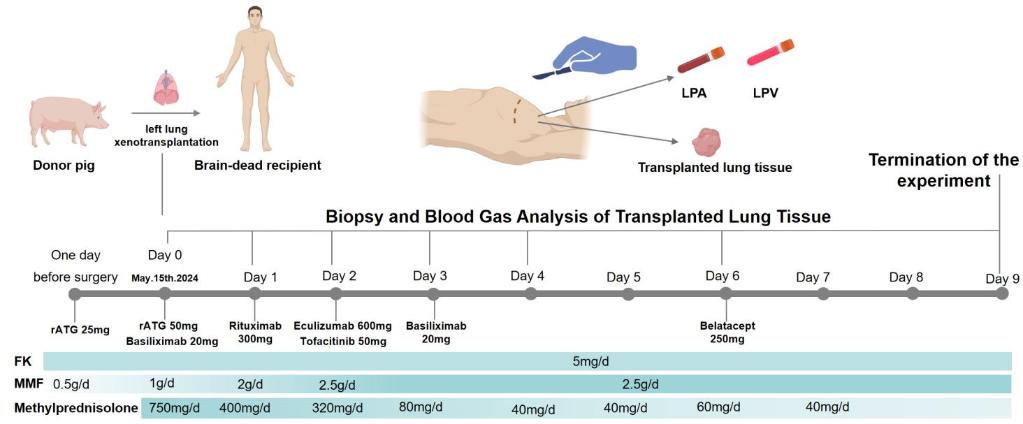 廣州醫(yī)科大學(xué)附屬第一醫(yī)院教授何建行率領(lǐng)的研究團(tuán)隊(duì),將一只經(jīng)過基因編輯的巴馬香豬左肺移植到一名腦死亡者體內(nèi),模擬臨床常見的單肺移植手術(shù)。該供體豬經(jīng)過6處基因編輯,以降低其器官移植到人體后的免疫風(fēng)險(xiǎn)。手術(shù)后,呼吸、血液、影像等監(jiān)測數(shù)據(jù)顯示,移植肺維持通氣與氣體交換功能長達(dá)9天,其間未發(fā)生超急性排異反應(yīng),同步病原學(xué)監(jiān)測也未發(fā)現(xiàn)活躍感染跡象。