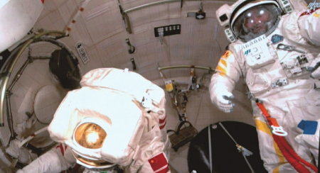 北京航天飛行控制中心屏幕拍攝的航天員艙內(nèi)工作畫面。