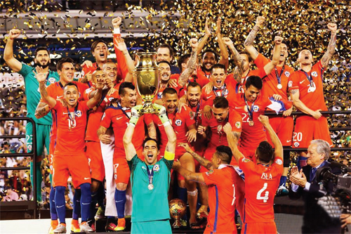 6月26日,智利隊(duì)門將布拉沃(前左一)在頒獎儀式上捧杯慶祝奪冠。當(dāng)日,2016年百年美洲杯決賽在美國新澤西舉行,智利隊(duì)與阿根廷隊(duì)在120分鐘內(nèi)0比0戰(zhàn)平,智利隊(duì)在點(diǎn)球大戰(zhàn)中以4比2戰(zhàn)勝阿根廷隊(duì),奪得冠軍。