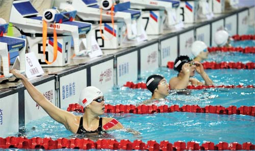4 月16 日,在太原進行的2018 年全國游泳冠軍賽暨亞運會選拔賽女子100 米仰泳預賽中,浙江隊選手傅園慧以1 分00 秒83 的成績晉級決賽。圖為傅園慧(下)在賽后查看比賽成績。