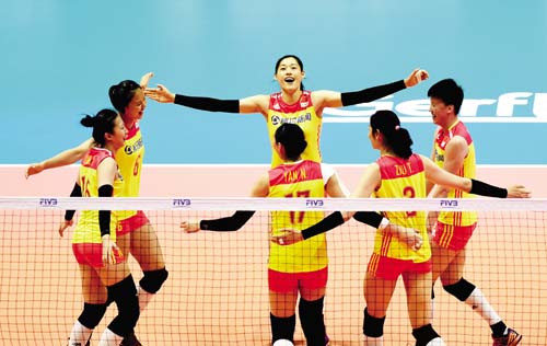 圖為中國(guó)女排隊(duì)員在比賽中慶祝
