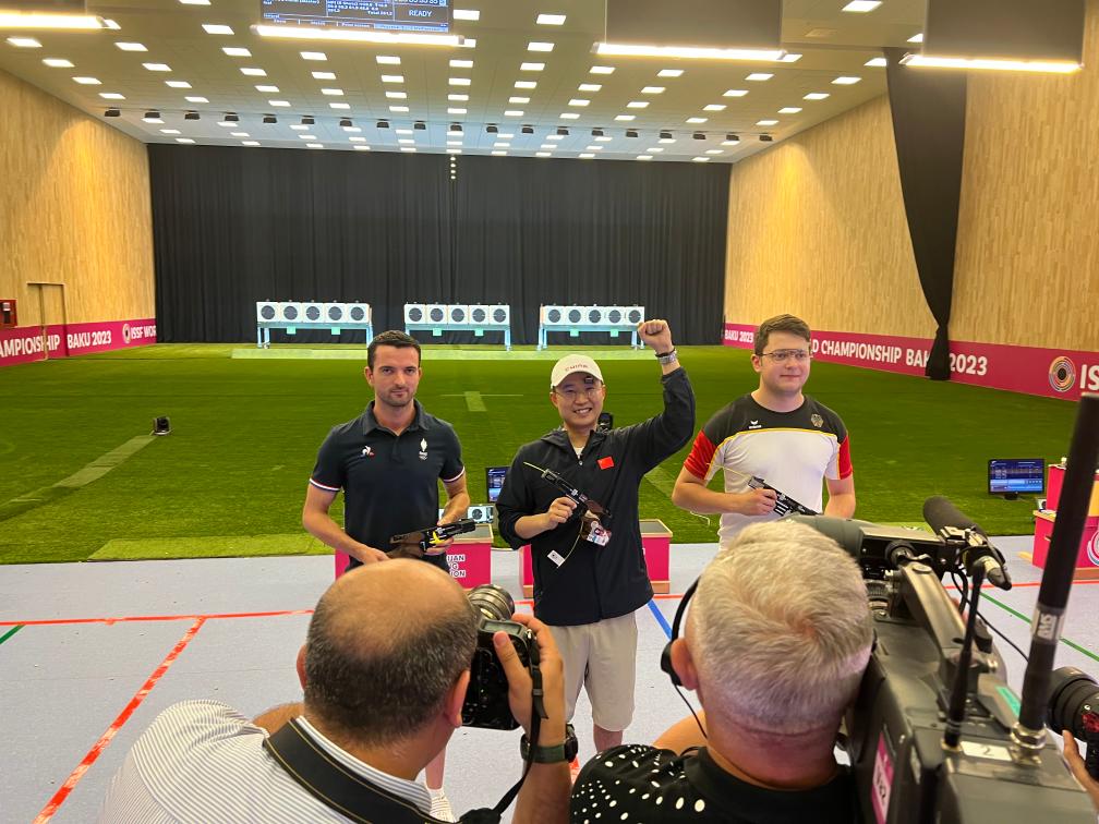 該項(xiàng)目比賽中,中國(guó)隊(duì)老將新人都有出色發(fā)揮。首次參加國(guó)際比賽的王鑫杰資格賽打出588環(huán)排名第一,與位居次席的李越宏攜手晉級(jí)決賽。他們兩人與劉楊攀組成的中國(guó)隊(duì)團(tuán)體成績(jī)1756環(huán),追平了世界紀(jì)錄,足足領(lǐng)先亞軍德國(guó)隊(duì)16環(huán)。