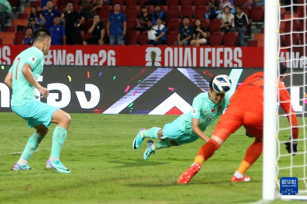 11月16日,中國(guó)隊(duì)球員王上源(中)在比賽中頭球攻門(mén)得分。當(dāng)日,在泰國(guó)曼谷舉行的2026世界杯預(yù)選賽亞洲區(qū)36強(qiáng)賽C組比賽中,中國(guó)隊(duì)以2比1戰(zhàn)勝泰國(guó)隊(duì)。新華社記者 王騰 攝