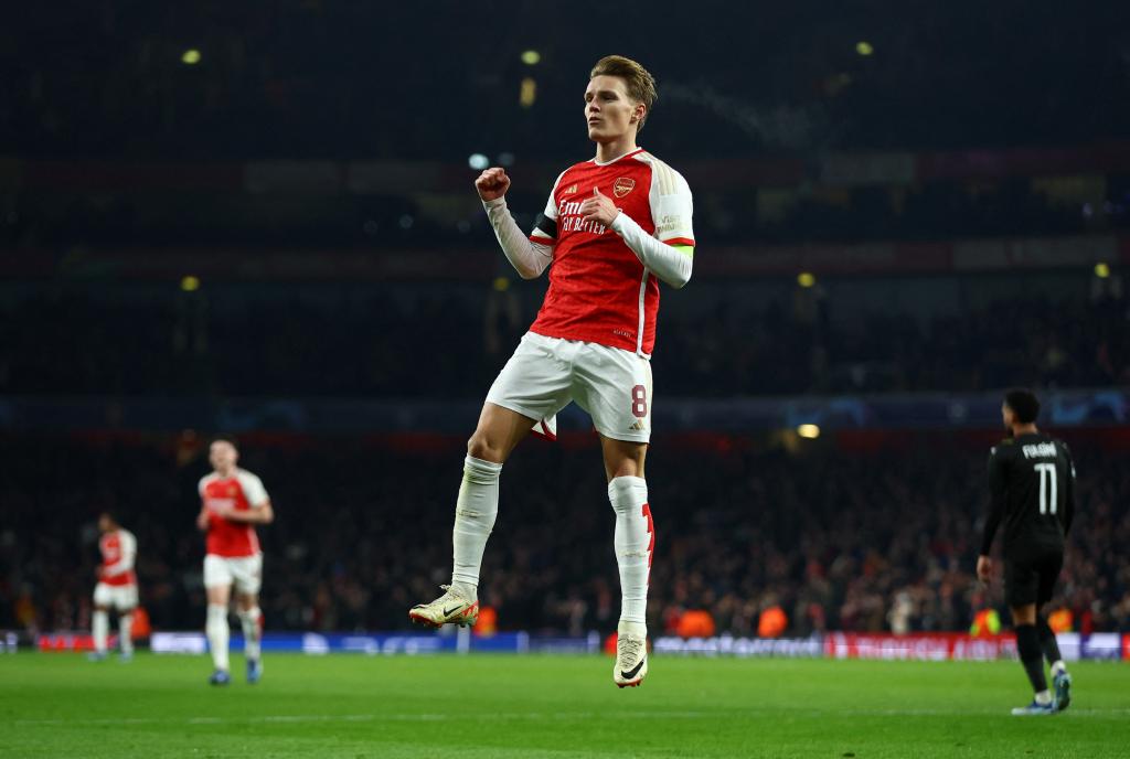 11月29日,阿森納隊球員厄德高在比賽中慶祝進球。