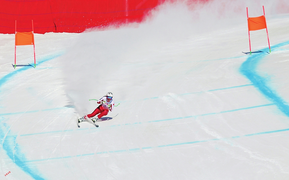 高山之巔,白雪之上,滑雪運(yùn)動員在落差高達(dá)547米的雪道上滑降,他們穿行、回轉(zhuǎn),快似閃電,如雪上飛燕。