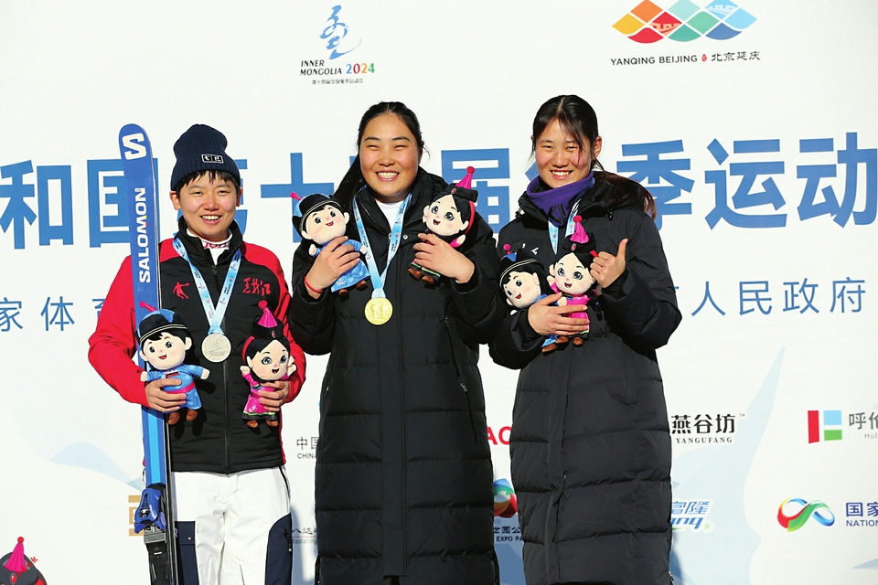 公開組女子滑降比賽頒獎現(xiàn)場,冠亞季軍合影。
