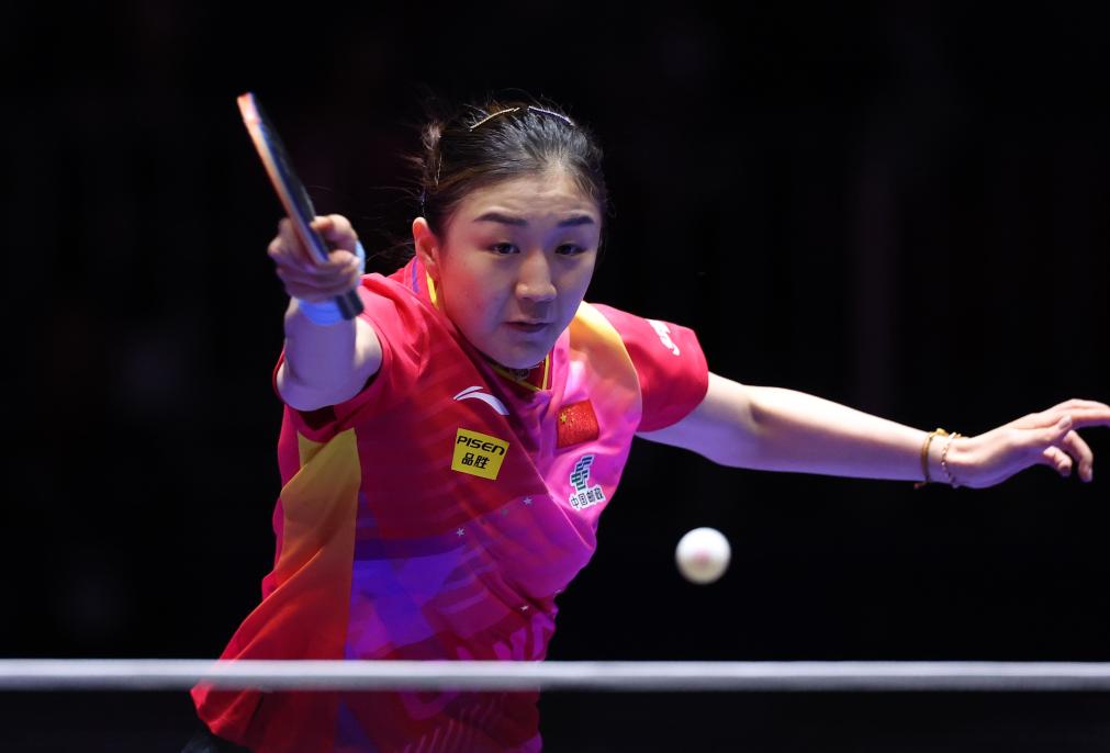 2月21日,中國(guó)隊(duì)球員陳夢(mèng)在第一盤比賽中回球。新華社記者 楊世堯 攝