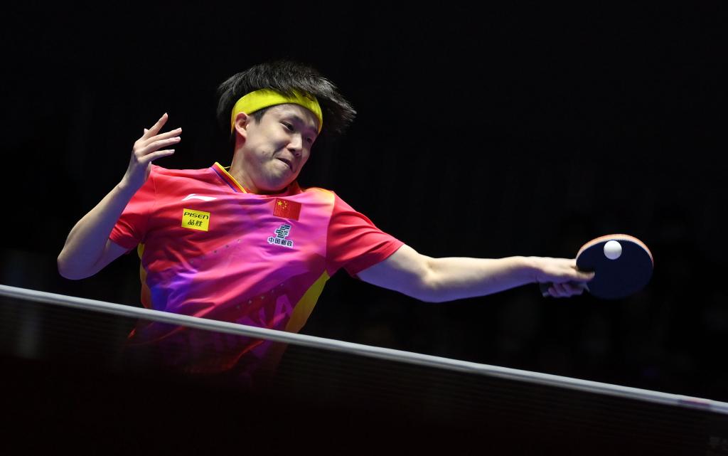 2月21日,中國(guó)隊(duì)球員王楚欽在第一盤比賽中回球。新華社記者 陶希夷 攝