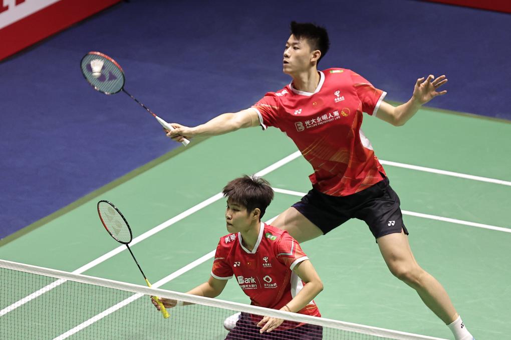 3月10日,馮彥哲(上)/黃東萍在比賽中。新華社發(fā)(奧雷利安·莫里薩爾攝)