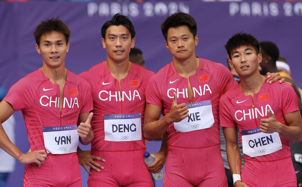 8月8日,中國隊選手陳佳鵬、謝震業(yè)、鄧智艦、嚴海濱(從右至左)在比賽后。新華社記者 李明 攝