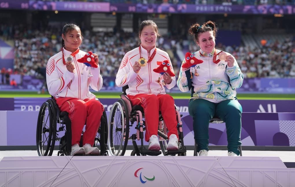 9月2日,冠軍中國選手鄒莉娟(中)、亞軍中國選手左彩云(左)與季軍澳大利亞選手克里斯在頒獎儀式上合影。新華社記者 才揚 攝 在1984年的第七屆殘奧會上,平亞麗以4米28的成績打破世界紀錄,獲得B2級跳遠金牌,為中國殘奧田徑和中國殘奧體育代表團拿下首枚金牌。當3日上午的田徑比賽結束時,中國殘奧體育代表團已經在巴黎殘奧會上贏得45枚金牌,暫列獎牌榜榜首,其中13枚誕生在田徑賽場。 新秀鋒芒畢露,老將老而彌堅。 25歲的周霞和20歲的郭芊芊在女子100米T35級和女子200米T35級中連續(xù)攜手登上領獎臺,沉甸甸的兩金兩銀是對青春最好的褒獎。22歲的黃俊第一次參加殘奧會就奪得男子鉛球F41級銅牌,這僅僅是他第二次參加國際大賽,上一次是今年5月在日本舉行的殘疾人田徑世錦賽。 41歲的楊月在1日進行的女子鐵餅F64級比賽里終于圓夢,和40歲的姚娟為中國隊包攬金銀牌。楊月從2004年雅典開始就從未缺席殘奧會,姚娟更是16歲時就在2000年悉尼殘奧會上摘得女子標槍F44級桂冠。一腔熱血,傳奇已成。