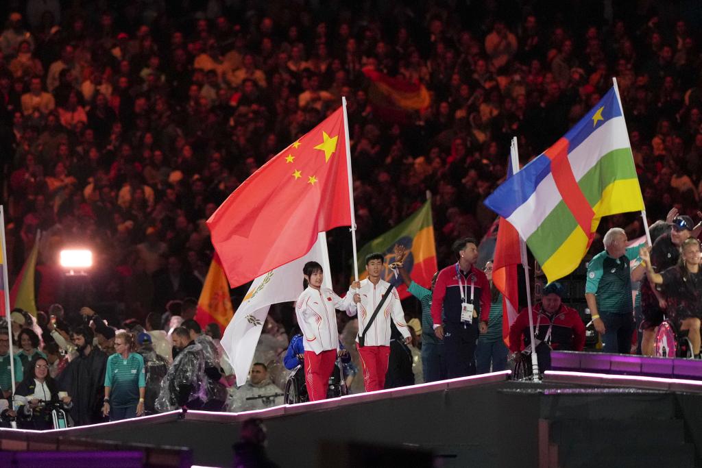 9月8日,巴黎殘奧會中國體育代表團(tuán)旗手女子游泳運(yùn)動員蔣裕燕(中左)和男子田徑運(yùn)動員邸東東(中右)在閉幕式上入場。新華社記者 黃偉 攝