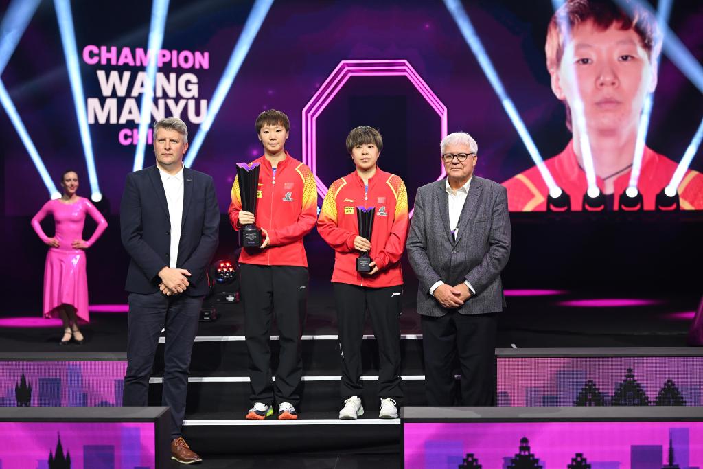 11月10日,王曼昱(左二)和王藝迪(右二)在頒獎(jiǎng)儀式上。新華社發(fā)(烏爾里希·胡夫納格爾攝)