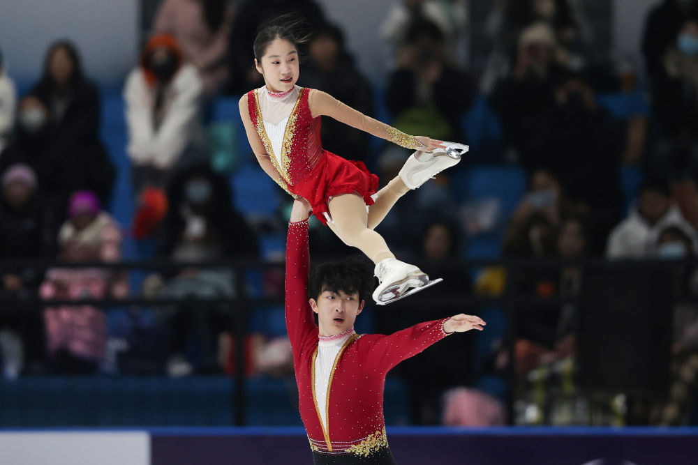 北京冬奧會(huì)后,雙人滑人才斷檔,符合成年組參賽資格的組合數(shù)量稀少,實(shí)力也大幅下降。然而在冠軍賽上,幾對(duì)年輕組合的表現(xiàn)令人驚喜。13歲的郭蕊和18歲的張益文自由滑開場(chǎng)就展示了一個(gè)漂亮的捻轉(zhuǎn)四周,這個(gè)難度極高的動(dòng)作曾是北京冬奧會(huì)上隋文靜/韓聰?shù)闹苿俳^招。此外,兩人的三周拋跳高度和遠(yuǎn)度也令人驚嘆。郭蕊和張益文搭檔了三年多,兩人的單跳還略弱一些。他們最終以164.47分獲得冠軍賽季軍。