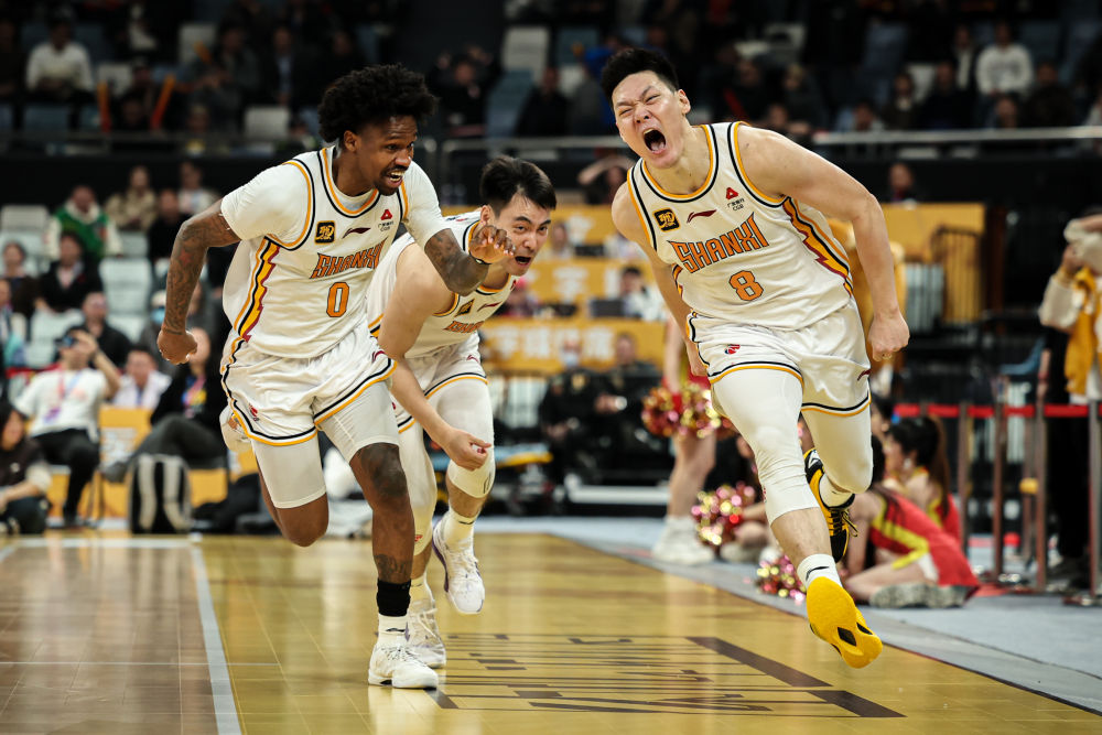 3月5日,山西汾酒隊(duì)球員張寧(右)命中絕殺球后慶祝。新華社記者 江漢 攝
