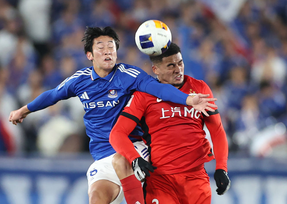 3月11日,上海海港隊球員蔣光太(右)與橫濱水手隊球員淺田大翔在比賽中爭頂。新華社記者 賈浩成 攝