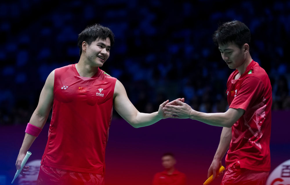 4月28日,中國隊(duì)組合梁偉鏗(左)/王昶在男雙比賽中慶祝得分。最終,梁偉鏗/王昶2:0戰(zhàn)勝中國香港隊(duì)組合洪魁駿/呂俊瑋。新華社記者 孫非 攝