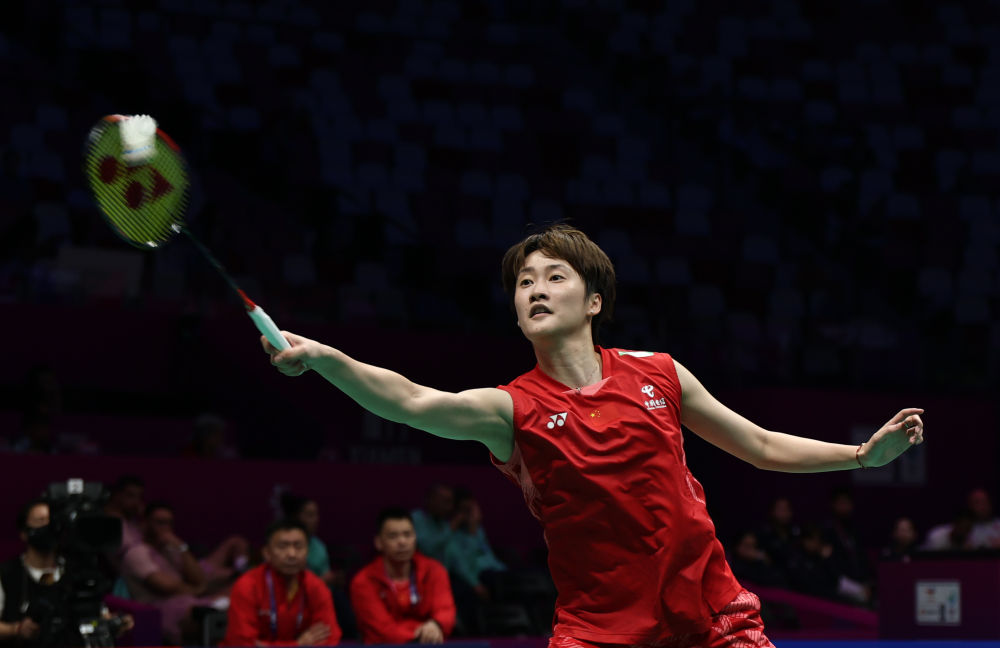 4月28日,中國隊(duì)選手陳雨菲在女單比賽中回球。最終,陳雨菲2:0戰(zhàn)勝中國香港隊(duì)選手盧善恩。新華社記者 魏培全 攝