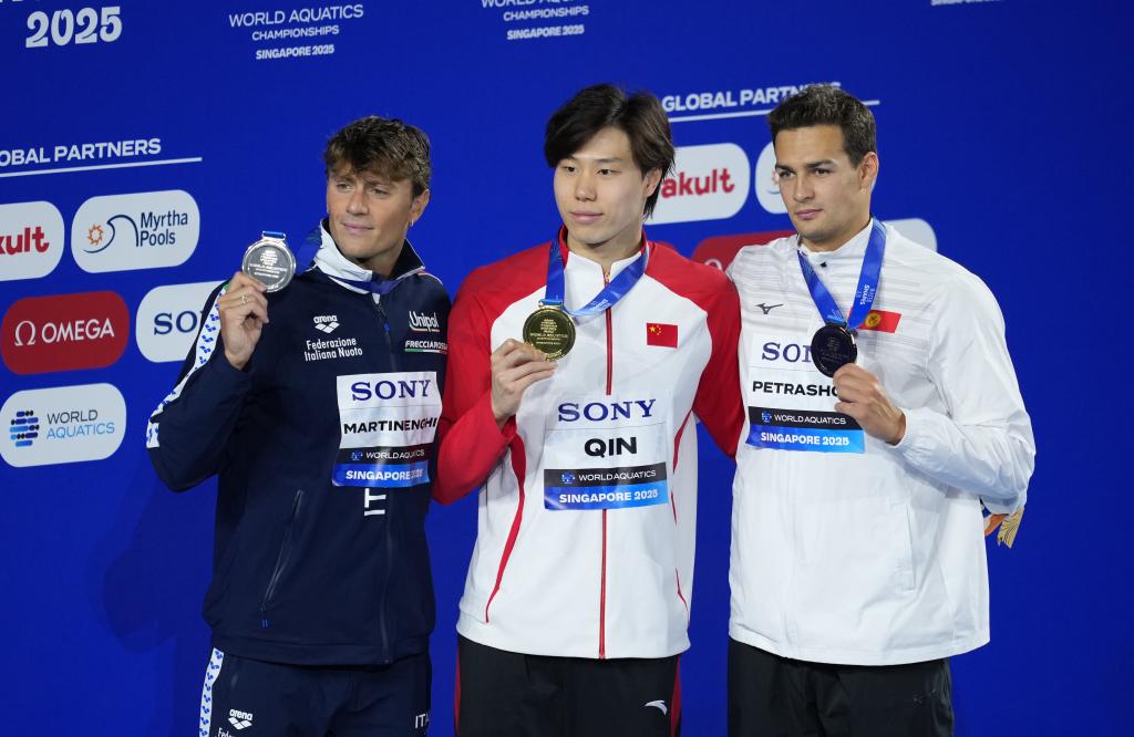 7月28日,冠軍中國選手覃海洋(中)、亞軍意大利選手馬丁嫩吉(左)和季軍吉爾吉斯斯坦選手彼得拉紹夫在頒獎(jiǎng)儀式上。新華社記者 伍志尊 攝