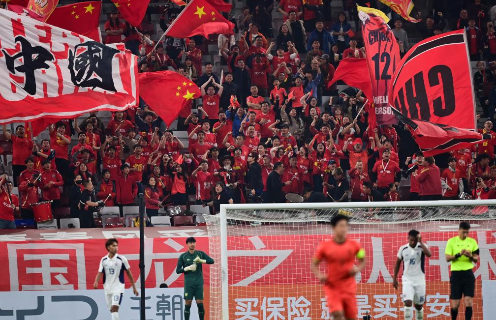3月25日,球迷在中國隊進球后慶祝。新華社記者 鄒競一 攝