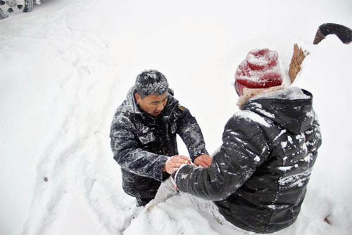 接到110指揮中心救援指令后,民警立即整裝出發(fā),并在途中與報警人周女士取得了聯(lián)系。車輛行至山間,救援難度超出了想象,整個山上都被大雪籠罩,白茫茫的一片,報警人也說不清自己遇險的具體位置。救援民警想到與報警人通過微信聯(lián)系,獲得位置共享。在得到大概位置后,車輛卻遇到冰雪無法前行,救援民警只能徒步前往,在被冰雪覆蓋的山路上一腳深一腳淺地行走,也記不清一路上跌跌撞撞摔倒了幾次,眼看著快接近信息顯示位置了,卻無法準確定位,只能繼續(xù)聯(lián)系報警人,讓她試著喊幾聲,以便確定具體方位,聽到聲音后,民警順著聲音方向前進,經(jīng)過一個多小時的艱難跋涉,終于在去往鳳林寺半山腰的樹林里找到了周女士。簡單了解了周女士傷情后,民警康艷軍小心翼翼地把周女士一路背下了山,令其脫離了險境。