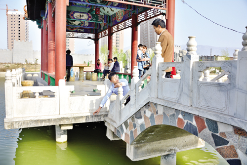 這個(gè)時(shí)候,宋利峰和女友劉丹,帶著姐姐的孩子也恰好走進(jìn)水榭。孩子們在興趣方面往往會有驚人的趨同感,宋利峰的小外甥“眼饞”月月手里的魚食,在韓建萍的開導(dǎo)下月月從袋子里抓了一把魚食給了這個(gè)陌生的小伙伴。月月仍在水榭西側(cè)的欄桿處向水面撒食,宋利峰的小外甥在石拱橋上模仿月月的動(dòng)作,兩個(gè)孩子之間的斜線距離不足一米。