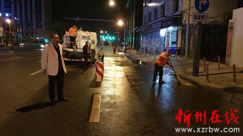 寂靜的夜晚伴隨著酒水車的轟鳴聲一股股清澈的水流噴灑在馬路上,街頭沉現(xiàn)著一個個揮舞著掃帚的橙黃色身影,點綴的忻州城區(qū)的夜色更加靚麗。