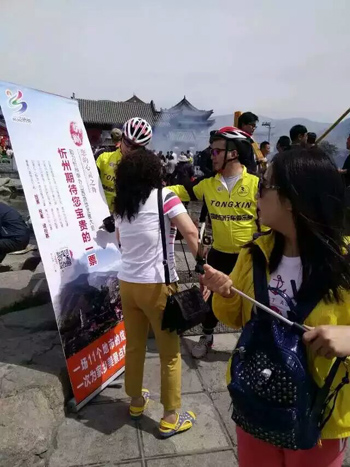 5月19日,在第六個(gè)“中國(guó)旅游日”,共青團(tuán)五臺(tái)縣委組織20余名青年騎行愛好者,騎著單車來到五臺(tái)山核心景區(qū),拉起宣傳畫,耐心向來山游客講解投票方法,動(dòng)員廣大游客為忻州申辦山西旅游發(fā)展大會(huì)投下寶貴一票。(劉力強(qiáng) 攝)