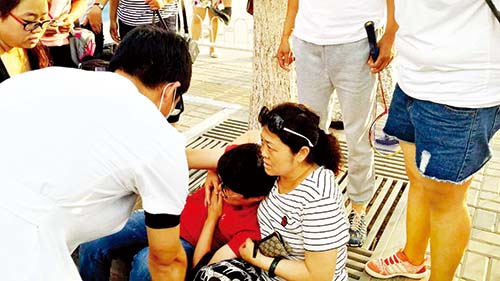 “孩子,你要挺住,一定要堅持,有阿姨在,你肯定不會有事的?!眲⒃龇也粩嘟o男青年打氣鼓勁,她的衣服都被男青年的虛汗浸濕了,并且明顯感覺到男青年急速的心跳。她心里默默禱告著“懷里的孩子”平安無事,也期盼著救護車快快到來。