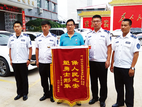 “謝謝你們的幫助,讓我被搶的財物失而復得,謝謝、謝謝……”7月13日下午,家住我市城區(qū)學府街的謝先生連聲感謝,將一面寫有“保人民之安塑勇士形象”字樣的錦旗送到了市城建支隊協(xié)管大隊城管隊員張志、楊勇江、劉宇鑫、李仁杰手中,表達他對市城建支隊城管隊員們見義勇為、熱心為民的感激之情。