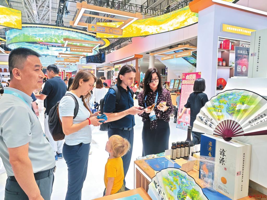 國外客商正在詳細(xì)了解代州黃酒品類。記者魏鵬飛 攝
