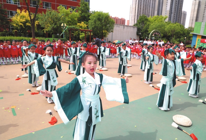 實(shí)驗(yàn)幼兒園的孩子們正在進(jìn)行漢風(fēng)古韻表演。 本報(bào)記者 張存良攝