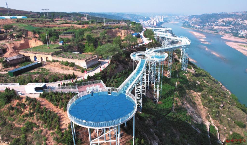 本報(bào)訊(記者魯明強(qiáng) 張劍雄)傍晚時(shí)分,位于保德縣城東北部的義門鎮(zhèn)廟峁村山巔的玻璃棧道霓虹閃爍,游人絡(luò)繹不絕。人們?cè)诓A5捞魍h(yuǎn)方,奔流不息的黃河、巍然屹立的天橋水電站、華燈初上的保德縣城和府谷縣城夜景盡收眼底。人們?cè)跓艄忤驳木徘S河造型的玻璃棧道上走過一個(gè)個(gè)聲光電烘托的主題區(qū)域,體驗(yàn)著自由浪漫、驚險(xiǎn)刺激的樂趣。這是近日記者在保德縣采訪時(shí)看到的情景。