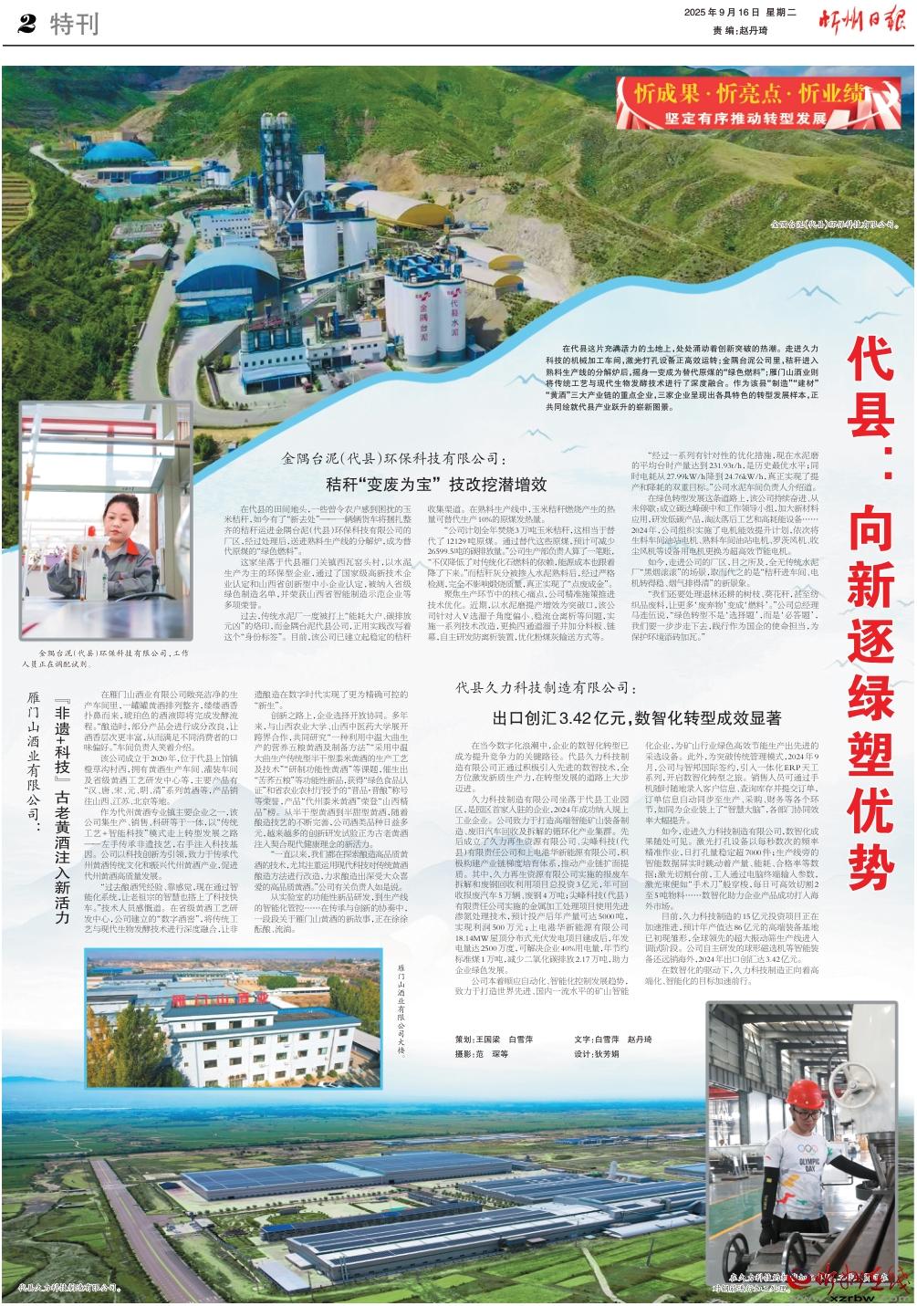 在代縣這片充滿活力的土地上,處處涌動著創(chuàng)新突破的熱潮。走進(jìn)久力科技的機(jī)械加工車間,激光打孔設(shè)備正高效運(yùn)轉(zhuǎn);金隅臺泥公司里,秸稈進(jìn)入熟料生產(chǎn)線的分解爐后,搖身一變成為替代原煤的“綠色燃料”;雁門山酒業(yè)則將傳統(tǒng)工藝與現(xiàn)代生物發(fā)酵技術(shù)進(jìn)行了深度融合。作為該縣“制造”“建材”“黃酒”三大產(chǎn)業(yè)鏈的重點(diǎn)企業(yè),三家企業(yè)呈現(xiàn)出各具特色的轉(zhuǎn)型發(fā)展樣本,正共同繪就代縣產(chǎn)業(yè)躍升的嶄新圖景。